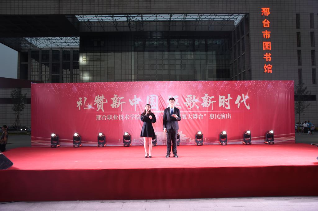 5月24日晚,我院2019年“礼赞新中国,讴歌新时代”欢乐邢襄大舞台百场文化惠民专场演出在邢台市图书馆前广场隆重举行。我院大学生以优美动听的演唱、热情奔放的舞蹈和富有学院特色的节目为广大市民献上了一场精彩的艺术盛宴。