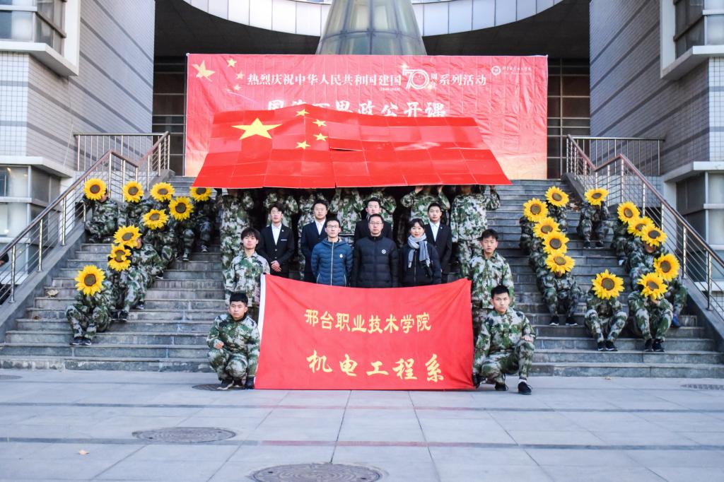 早上六时四十分,由学院国旗班组成的升旗方阵迈着整齐划一、铿锵有力的步伐,昂首阔步护卫着国旗走向升旗台。“向国旗——敬礼!”口令声响起,雄壮激昂的《义勇军进行曲》响彻校园。嘹亮歌声中,鲜艳的五星红旗冉冉升起、迎风飘扬。随后,机电系学子组成图案“70”并展示出“国旗”,学生王志明、丁子健、赵方和李宁昌共同演唱《我爱你,中国》,用真诚的歌声唱出对祖国的热爱与祝福。