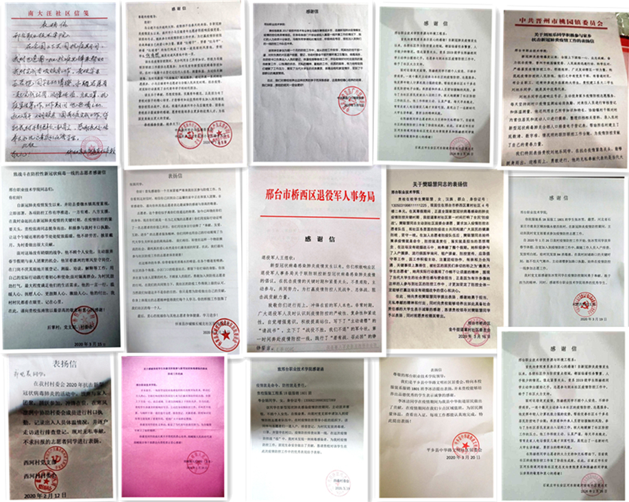截至目前,我院陆续收到30余封表扬信,表扬我院学子的责任担当,感谢他们的义无反顾。他们中有党员、共青团员,有学生干部、普通学生,他们面对疫情没有犹豫退缩,力所能及地投入到这场没有硝烟的战“疫”中,用实际行动温暖守护,贡献青春力量。一封封来自四面八方的感谢信,彰显着新时期我院学子的情怀与奋进。