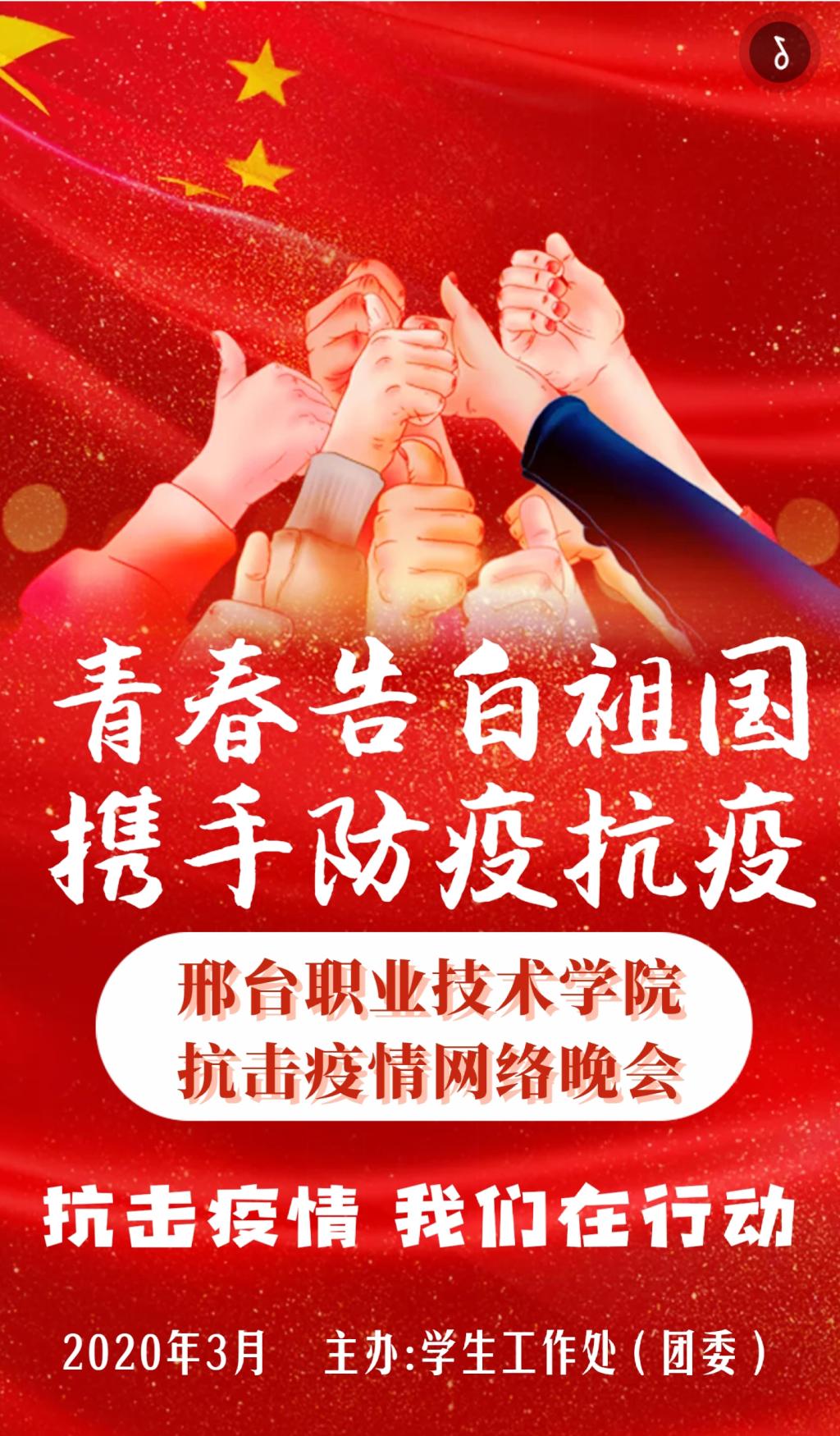 在全国上下团结一心、众志成城战“疫”的关键时期,我院深入贯彻落实教育部党组《教育系统关于学习宣传贯彻落实〈新时代爱国主义教育实施纲要〉的工作方案》要求,紧密围绕疫情防控重点,强化爱国主义思想引领,积极开展疫情期间大学生网络思想政治教育。3月29日,由我院学生工作处(团委)主办的“青春告白祖国、携手防疫抗疫”抗击疫情网络晚会正式上线发布。