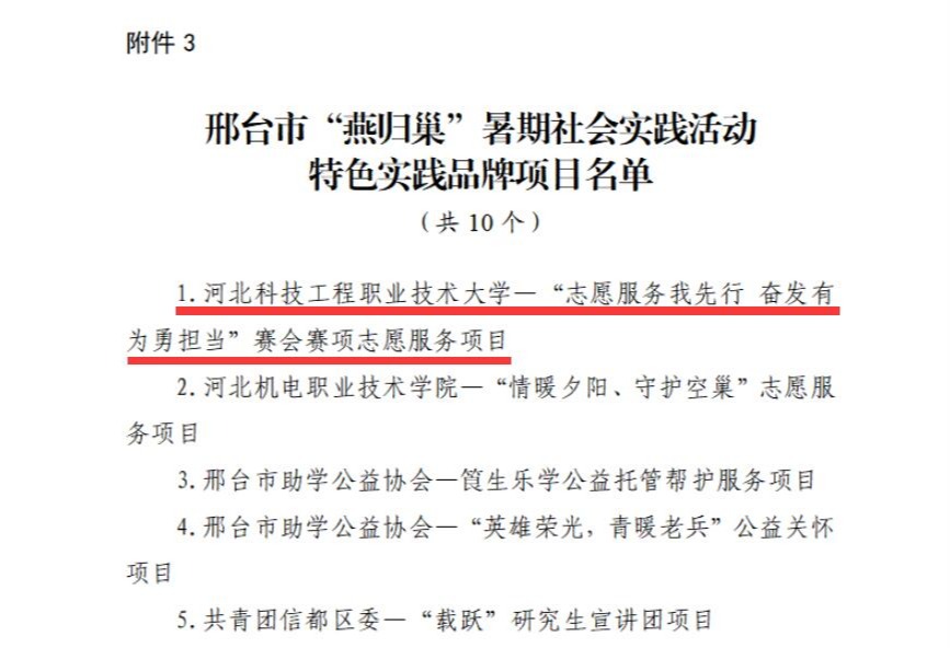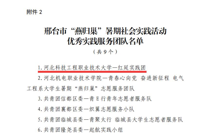 9月6日,共青团邢台市委员会、邢台市学生联合会联合下发《2022年度邢台市“燕归巢”暑期社会实践活动总结通报》,对2022年邢台市“燕归巢”暑期社会实践活动优秀大学生、优秀实践服务团队和特色实践项目进行通报表彰,best365荣获多项表彰。