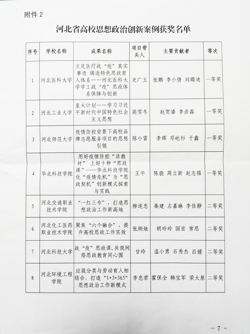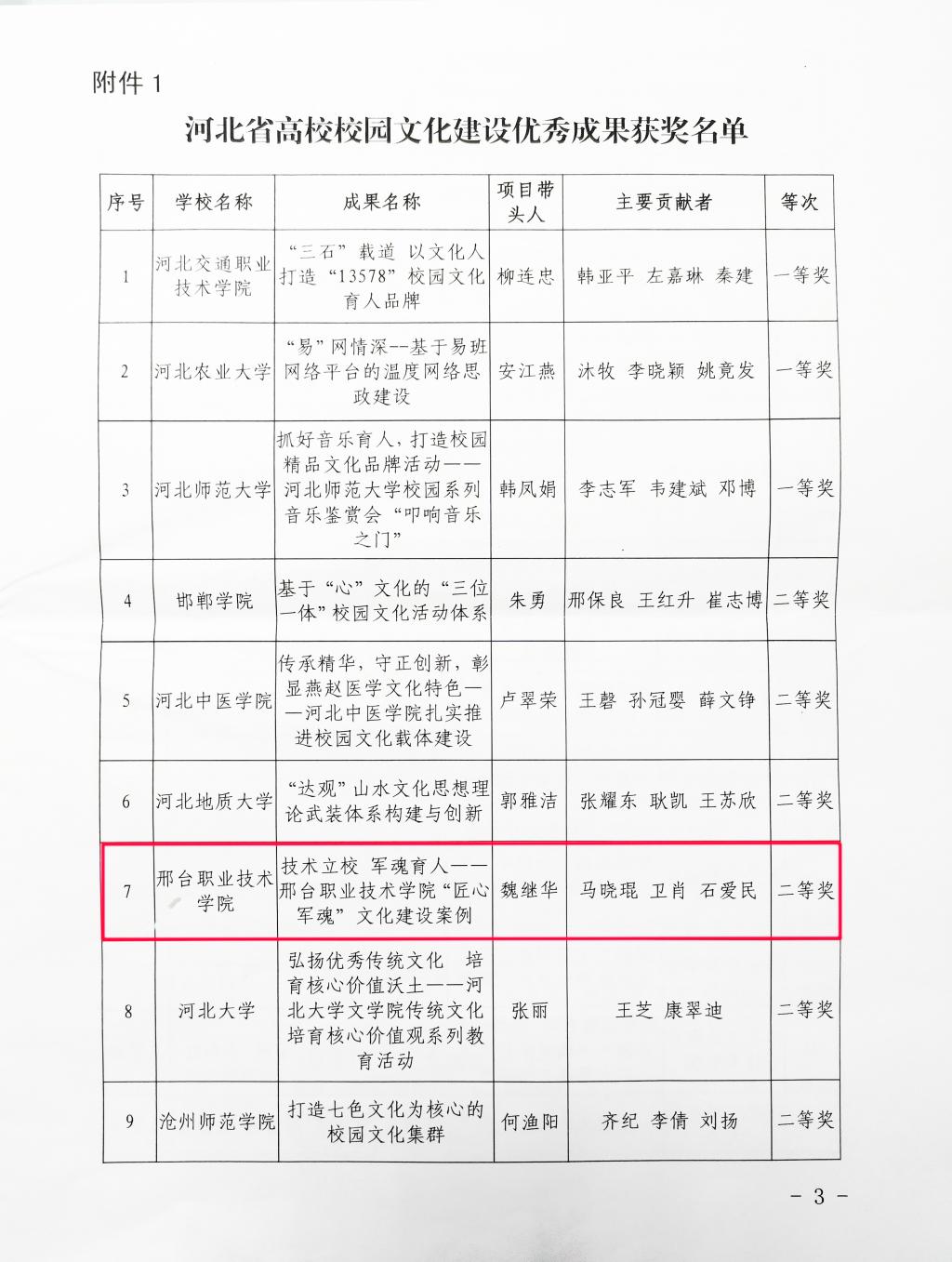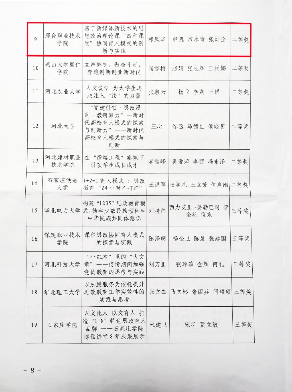日前,河北省教育厅公布了第十八届河北省高校思想政治工作成果评选结果,我院两项成果获奖。《技术立校军魂育人——邢台职业技术学院“匠心军魂”文化建设案例》荣获河北省高校校园文化建设优秀成果二等奖,《基于新媒体新技术的思想政治课“四种课堂”协同育人模式的创新与实践》荣获河北省高校思想政治创新案例二等奖。