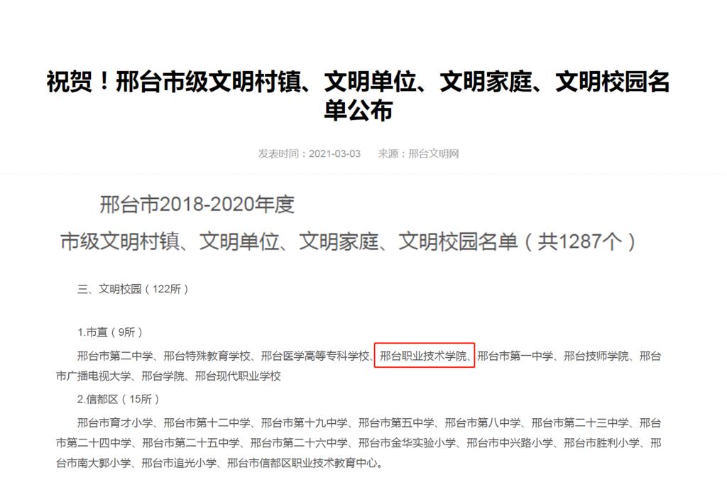 3月3日,邢台文明网刊登2018-2020年度邢台市级文明村镇、文明单位、文明家庭、文明校园名单(共1287个),我院再次被授予市级文明校园荣誉称号,这是我院广大师生共同努力的结果,也是对我院精神文明建设工作的充分肯定和极大鼓励。