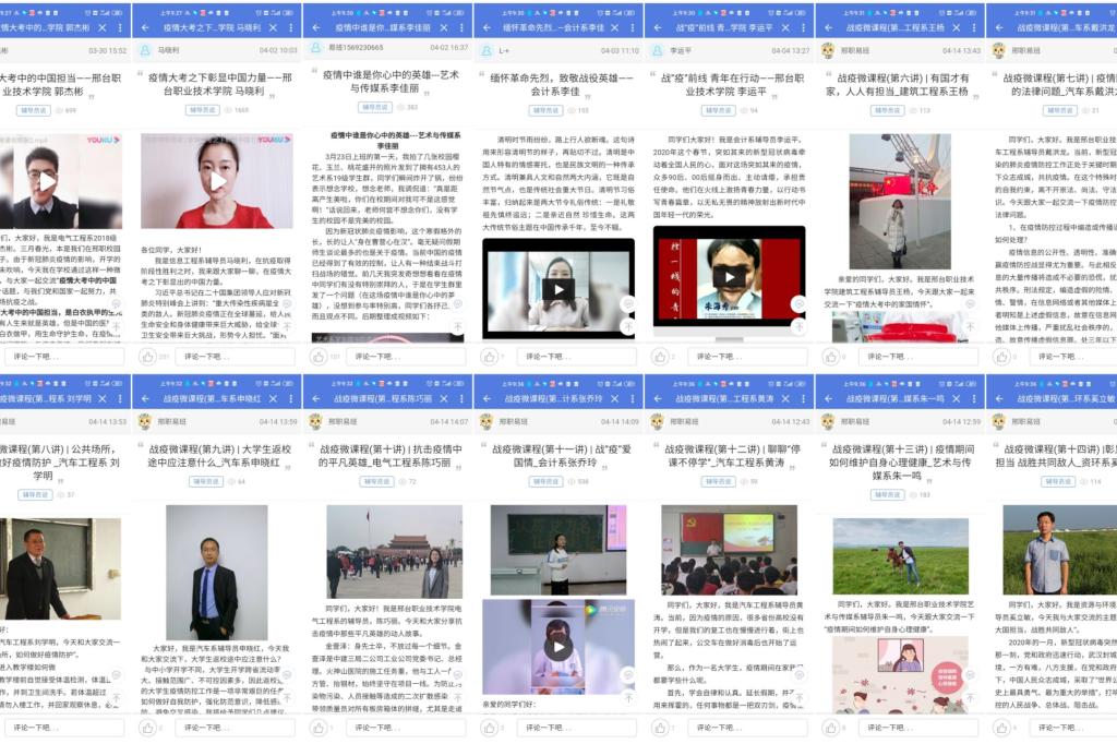 为落实学院“停课不停教不停学”总体要求,深挖疫情防控中的思想政治教育元素,因事而化、因时而进、因时而新地开展网络思政工作,自3月27日起,学生工作处依托易班微社区推出了“辅导员说|战‘疫’思政微课”专栏,旨在引导广大学生理性看待疫情发展,明确责任与担当,做正能量的传播者。