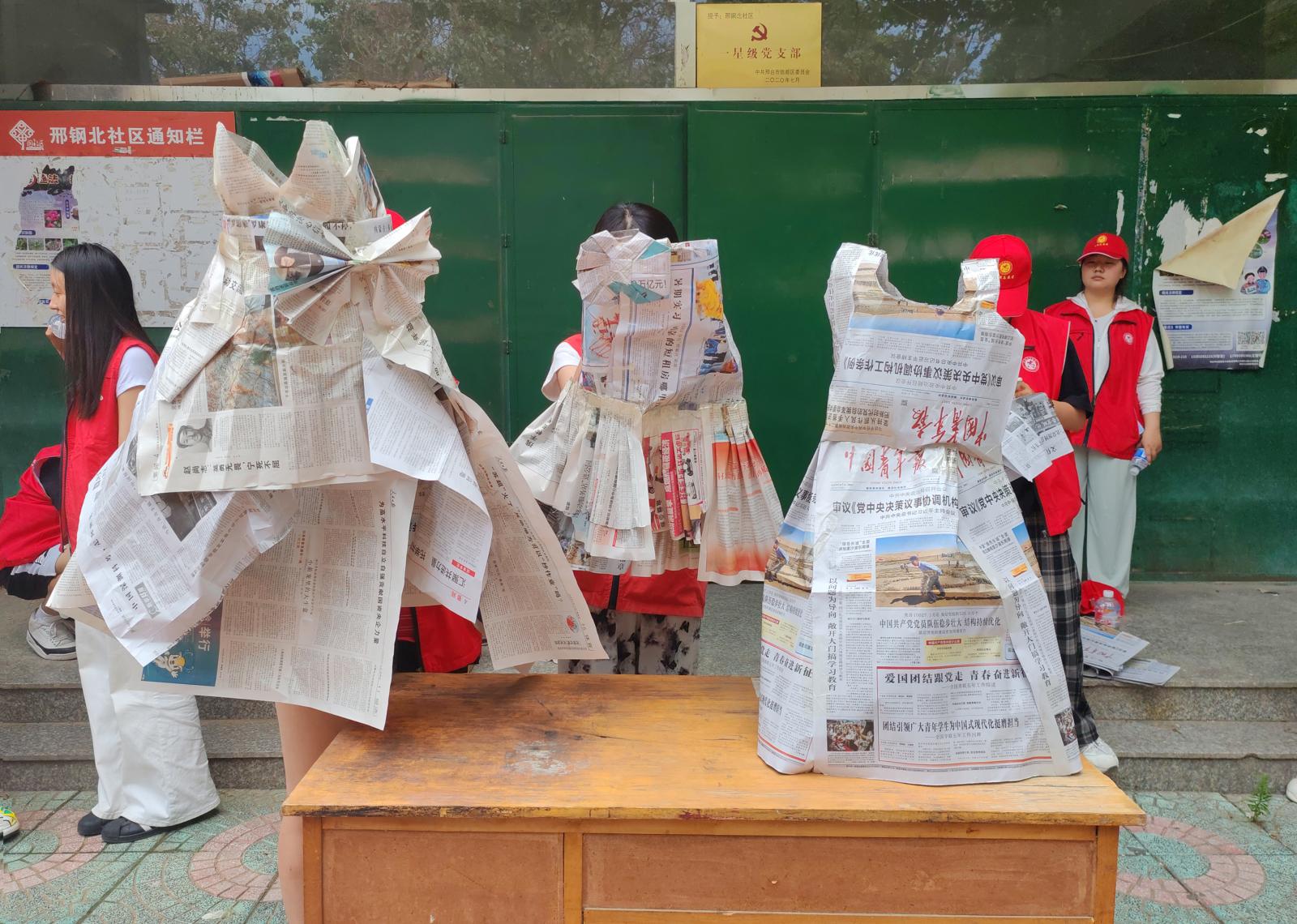 志愿者们先对小区绿化带、楼道、健身区等公共区域进行了全面清扫,清理垃圾与小广告,有效改善了社区环境。随后,志愿者们发挥专业优势,组织居民开展非遗创意手工活动。参与者分组协作,运用废旧纸张进行创意剪裁、设计和拼接,最终完成创意服装展示。活动巧妙融合传统剪纸艺术与现代服装设计,让居民在动手实践中感受中华文化魅力。