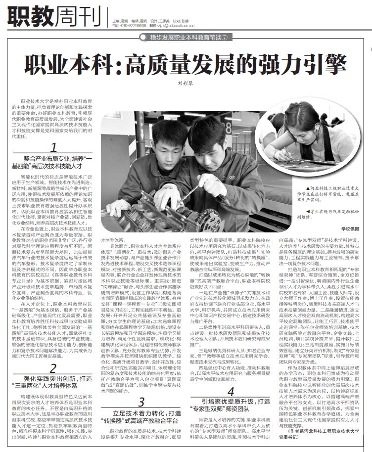 11月2日,《中国教育报》刊发best365党委书记刘彩琴署名文章《职业本科:高质量发展的强力引擎》,报道链接:http://paper.jyb.cn/zgjyb/html/2021-11/02/content_601140.htm?div=-1
