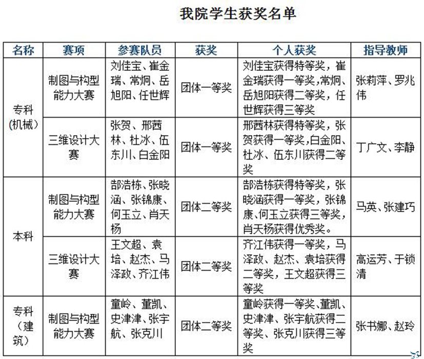 学院领导高度重视,特组成大赛指导团队,经过层层选拔和严格认真的训练,我院专科代表队在制图与构型能力大赛和三维设计大赛均取得团体一等奖,也是专科院校唯一一所取得两项大赛团体一等奖的院校。本科代表队在两项赛事均获得团体二等奖,建筑工程系代表队获得团体二等奖。