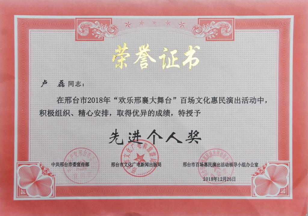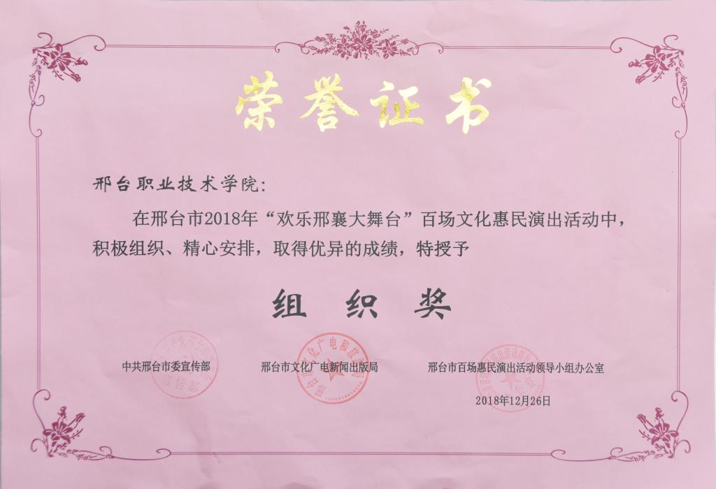 近期,邢台市委宣传部下发《关于邢台市2018年“欢乐邢襄大舞台”百场文化惠民演出活动先进集体、先进个人的通报》,我院荣获“组织奖”,学生工作处卢磊获得“先进个人奖”。