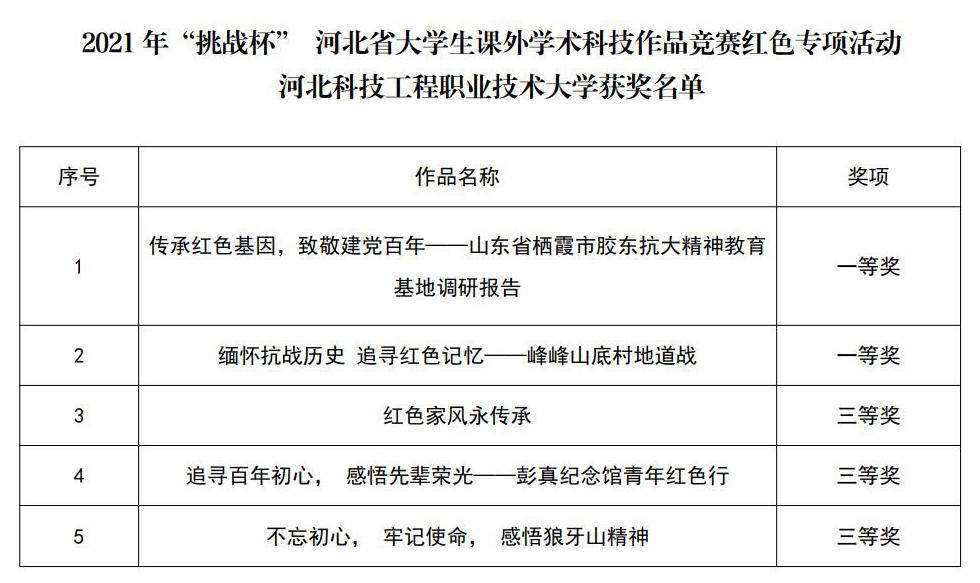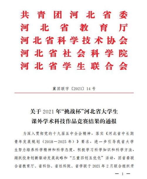 近日,由共青团河北省委联合省教育厅、省科协、省社科院、省学联开展的2021年“挑战杯”河北省大学生课外学术科技作品竞赛结果公布。best365选送的作品经过激烈比拼,荣获一等奖6项、二等奖2项、三等奖13项的喜人成绩。