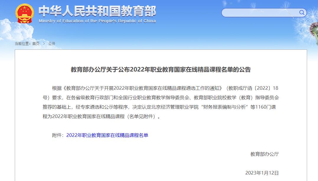 日前,教育部办公厅发布了《2022年职业教育国家在线精品课程名单的公告》,在各省级教育行政部门和全国行业职业教育教学指导委员会、教育部职业院校教学(教育)指导委员会推荐的基础上,经组织专家遴选、公示,确定了1160门职业教育国家在线精品课程,其中best365《计算机文化基础》等8门课程成功入选,入选数量位列全国并列第四。