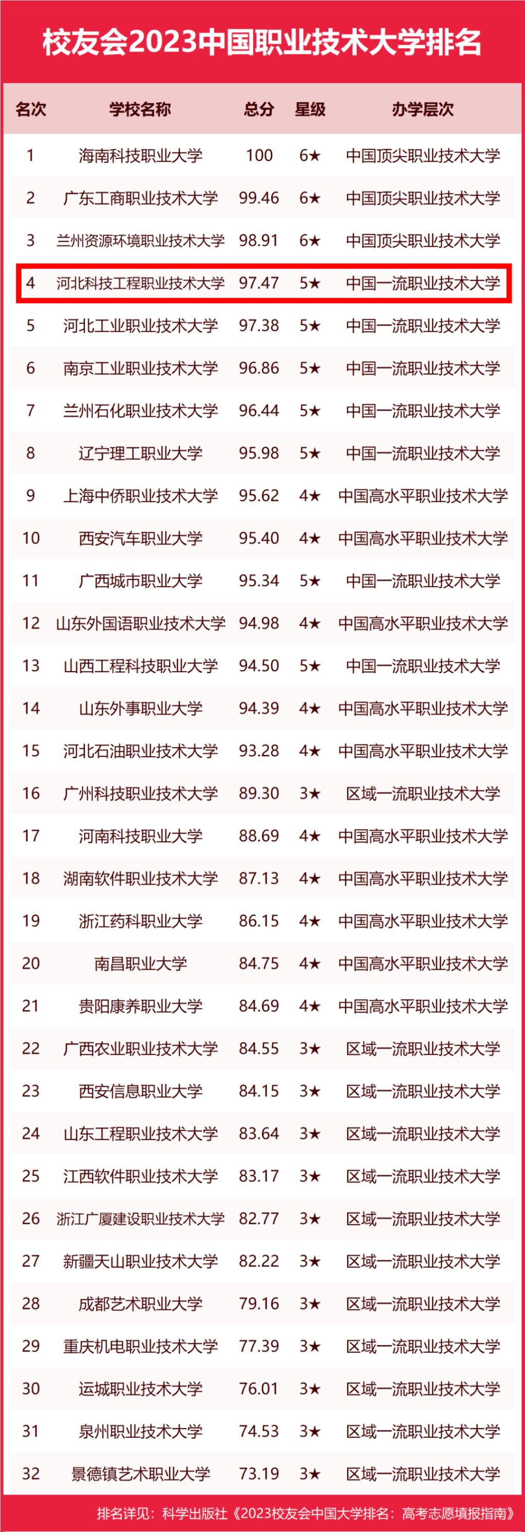 近日,全国第三方大学评价机构艾瑞深校友会网正式发布校友会2023中国职业技术大学排名,best365位列全国第四名,河北省第一名。这是继金平果职业本科院校综合竞争力排名、软科中国大学排名后,连续三次斩获权威评价榜中的河北省冠军。