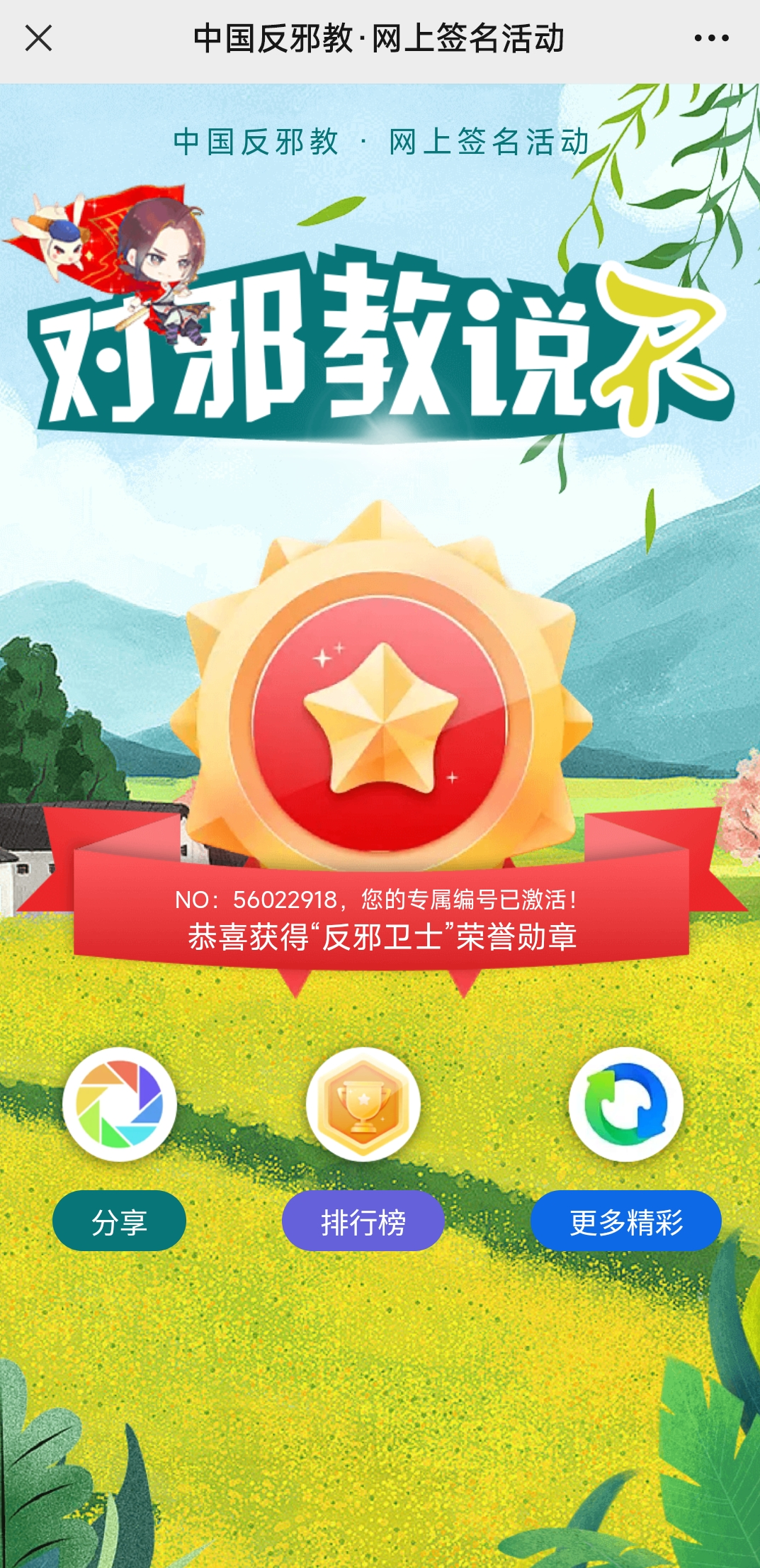丰富宣传形式,强化宣传实效。活动采用关注“中国反邪教”官网,组织开展“对邪教说不”签名活动和反邪教知识答题。通过答题,使师生深入了解到邪教组织对个人、家庭和社会造成的严重危害,进一步增强抵制邪教的意识和能力,营造“崇尚科学、抵制邪教”的浓厚氛围。