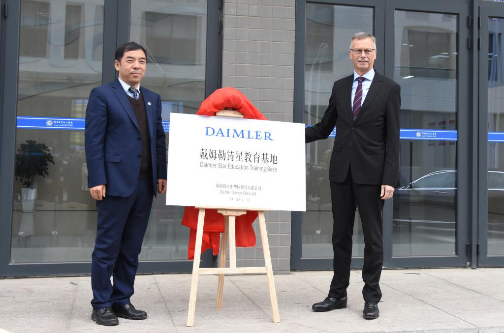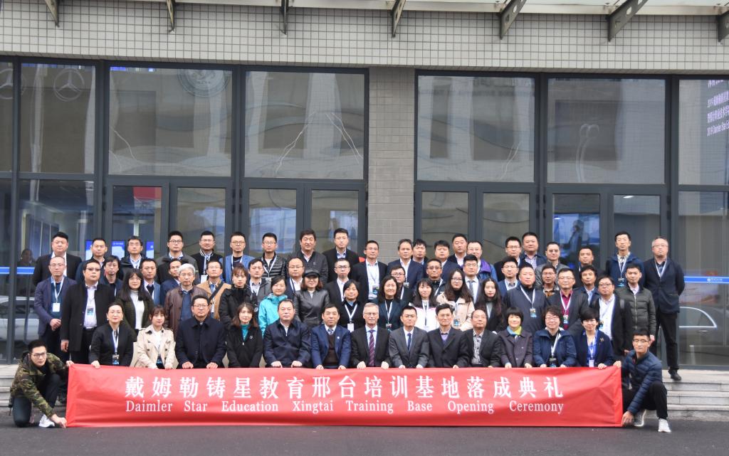 在汽车系大楼前,马金刚主任主持了戴姆勒铸星基地揭牌仪式,Oskar Heer总监、李贤彬副院长共同为新基地揭牌。随后,所有嘉宾在基地前合影留念。未来,基地将在整个京津冀地区发挥示范作用,更多的汽车工匠将从这里诞生,汽车专业也力将成为河北省职业教育一张有影响力的名片。