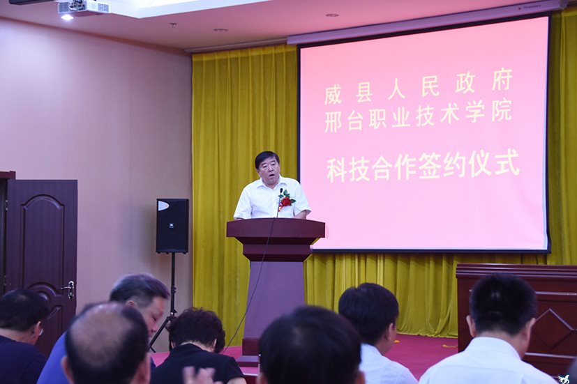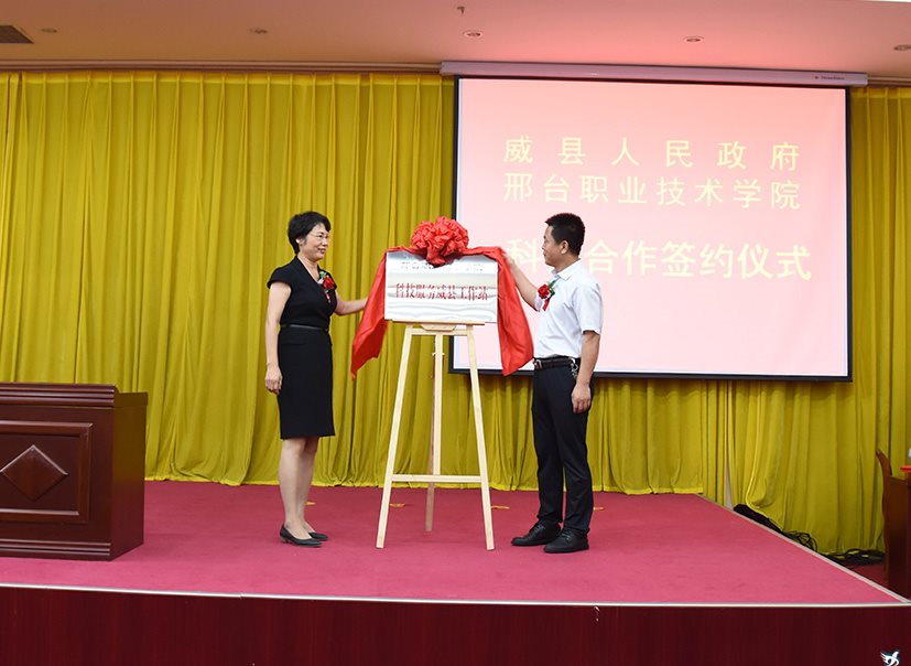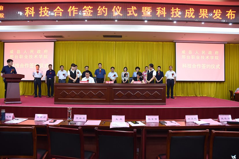 8月24日,我院与威县人民政府在威县隆重举行科技合作签约仪式暨科技成果发布会。威县县委副书记、县长商黎英,河北省教育厅职成处副处长史帆,威县副县长翁乃侠、高新区党工委副书记、管委会副主任高长英,河北女子职业技术学院党委书记窦新顺、院长盖春瑞,我院院长马东霄、副院长刘卫红等出席仪式。威县各政府部门、公司代表和学院专家组成员共100余人参加活动。仪式由威县副县长张磊主持。