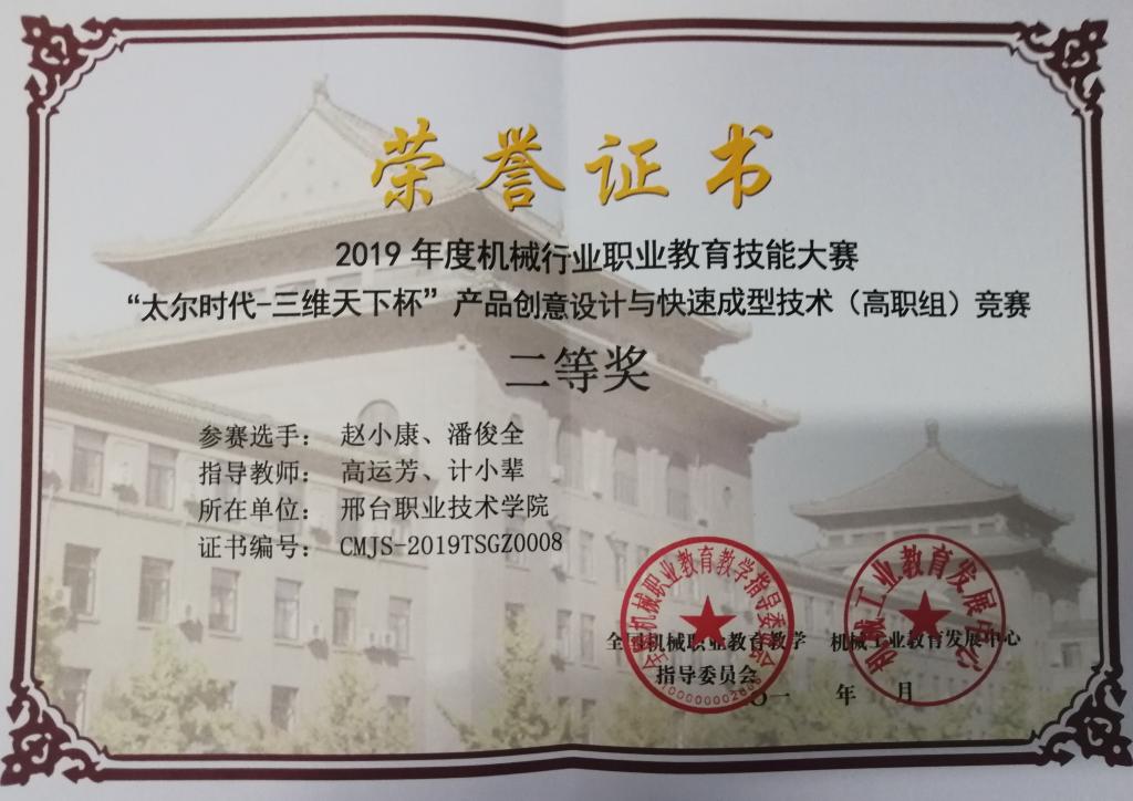 2019年全国机械行业职业教育技能大赛——“太尔时代—三维天下杯”产品创意设计与快速成型技术大赛于11月13日至18日在上海市工程技术管理学校举行,共有来自全国各地的近70个中、高职院校140名选手参赛。我院机电工程系学生赵小康、潘俊全初次参加此项比赛,最终取得大赛二等奖的好成绩。