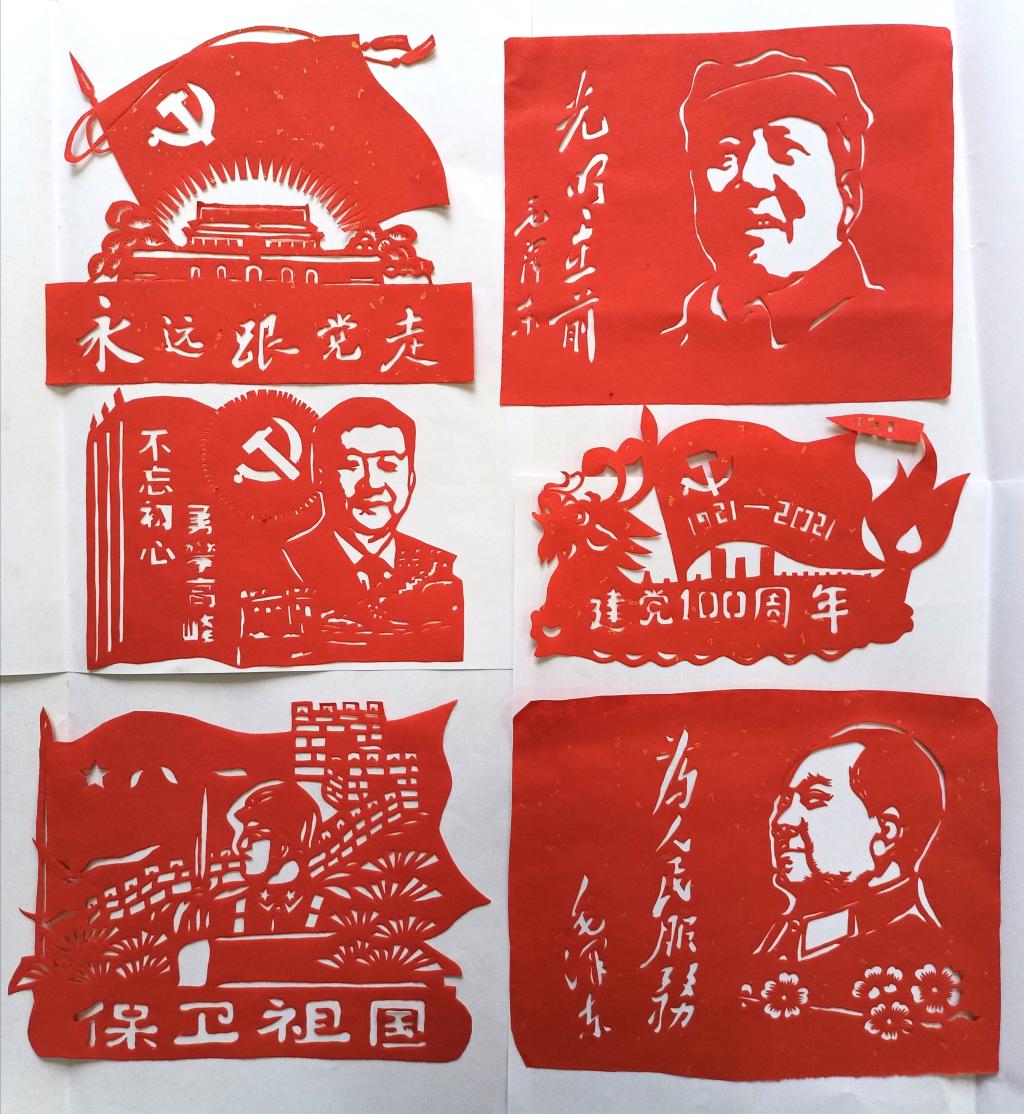 5月以来,在剪纸大师工作室负责人钱立稳老师指导下,同学们以爱国爱党为主题,把对党和祖国的祝福融入剪纸作品中,陆续剪出“永远跟党走”“为人民服务”“保卫家国”“不忘初心,勇登高峰”等系列剪纸作品,为建党100周年献上青年学子的一份礼物。这项活动将党史学习与传统艺术传承相结合,寄托了同学们对党的深厚感情和对祖国的美好祝福,用手中的刻刀,将爱党爱国的情怀深深地刻在心里。