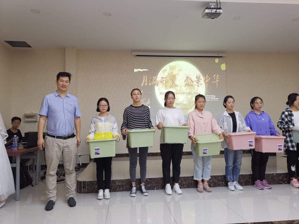 最后,学生处李磊副处长致辞。他表达了对同学们的节日祝福以及对大学生活的美好期盼;鼓励同学们努力学习、合理规划,要度过充实有意义的大学生活;李处长为建档立卡的学生代表发放中秋节慰问品。