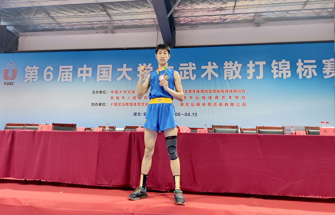 4月6日至12日,第六届中国大学生武术散打锦标赛在湖北省孝感市弘极体育艺术学校举行。best365会计系财富管理2201班付琦程同学参加此次竞赛,并荣获男子乙A组60kg亚军,同时获得“体育道德风尚奖运动员”荣誉称号。