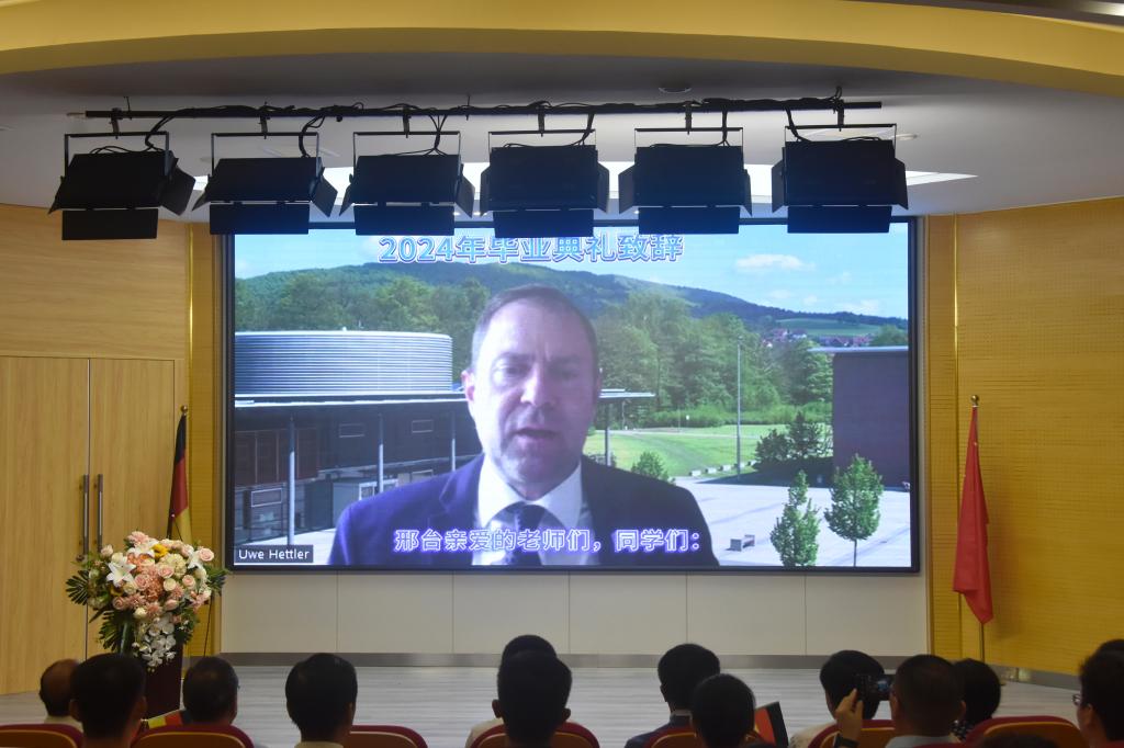 典礼上,马东霄代表学校向圆满完成学业的毕业生们表示祝贺并寄予希望。他指出,中德合作办学项目历经了九个春秋,形成示范引领合作办学品牌,他希望同学们牢记“德能并蓄,敏行担当”校训,敢为人先、坚韧不拔,在开放创新的新时代做应势而新的领跑者。德国施马卡尔登应用技术大学副校长海特勒博士通过视频祝贺同学们顺利毕业,并对即将赴德学习交流的师生表示欢迎。