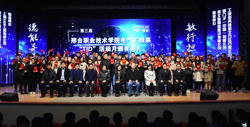 11月21日,我院电气工程系“TID”活动颁奖典礼在红星礼堂隆重开幕。学院党委书记刘彩琴,副院长刘卫红,教务处处长张国勋、副处长王学东,招生就业处处长胡集峰,学生处副处长李磊,学院团委书记王学志,电气工程系主任陈丽、书记石磊,河北省通信建设有限公司网络分公司人资招聘主管李绍阳,参加典礼并为获奖选手颁奖。学院党委书记刘彩琴向大会致辞。电气工程系全体教师和学生参加典礼。