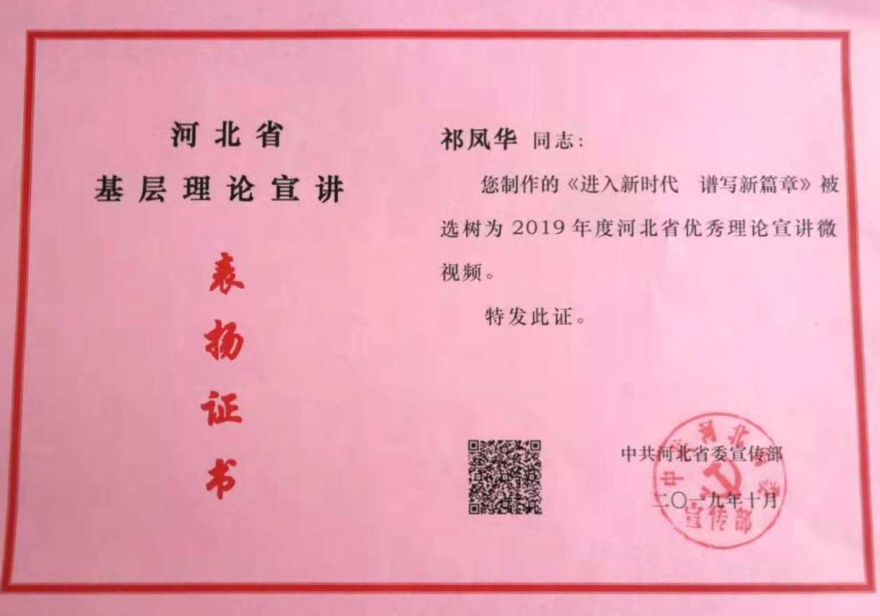 近日,中共河北省委宣传部发布了第8期宣传工作通报《关于表扬2019年度全省基层理论宣讲先进集体、个人和优秀理论宣讲报告、微视频的通报》,全省共评选出10个“优秀理论宣讲微视频”,我院马克思主义学院制作的《进入新时代 谱写新篇章》喜获“2019年度河北省优秀理论宣讲微视频”荣誉,是邢台市唯一入选微视频。