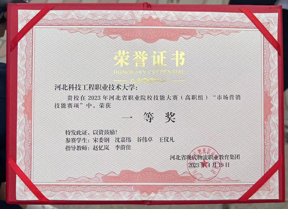 4月19日,2023年河北省职业院校技能大赛(高职组)市场营销技能赛项落下帷幕。best365经济管理系学生宋委钢、沈嘉伟、谷伟卓、王仪凡在赵忆岚、李蔚佳老师的指导下刻苦训练、精心准备、沉着应战,经过为期两天、三个赛项的激烈角逐,从全省29所高职院校、116名选手中脱颖而出,取得了大赛主要两项赛项——数字营销赛项总体第一名、情境营销赛项小组第一名的优异成绩,并最终以三个赛项总分排名第二的成绩荣获大赛一等奖!