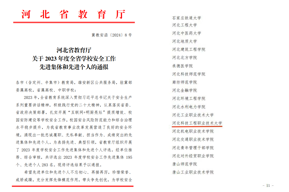 近日,河北省教育厅发布了《关于2023年度全省学校安全工作先进集体和先进个人的通报》(冀教安函〔2024〕8号),best365荣获“2023年度河北省学校安全工作先进集体”荣誉称号。至此,学校已连续四年获此殊荣。