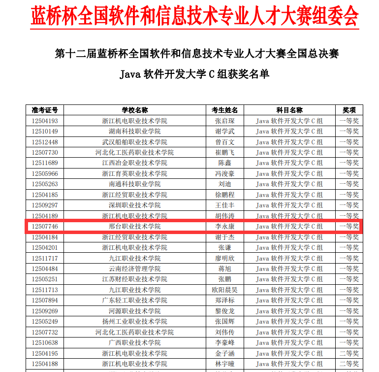 6月5日,信息工程系学生李永康在路俊维老师的指导下,参加第十二届蓝桥杯全国软件和信息技术专业人才大赛全国总决赛,荣获Java软件开发项目大学C组国赛一等奖。