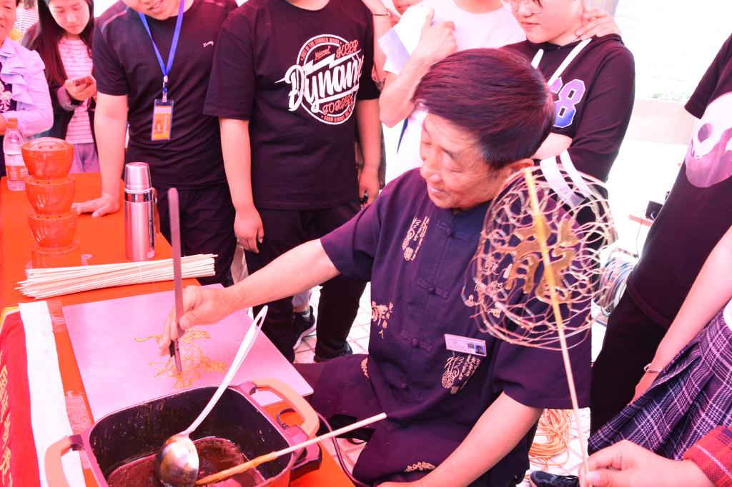 上午,学生处副处长李磊主持开幕式后,来自学院各系的师生约4000余人前来观看。每位艺人不仅现场展演技艺并且耐心地为大家讲解了这些民间艺术的发展及现状,其中,糖画艺术传承人高焕起老师现场制作糖人并鼓励同学们亲自动手体验。此外,同学们还尝试了窗花雕刻、皮影、草编等项目。传承师傅们手把手带大家制作了一些简单的工艺品,同学们与这些非遗项目近距离接触,深切感受到了中国传统文化的魅力。