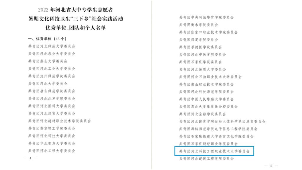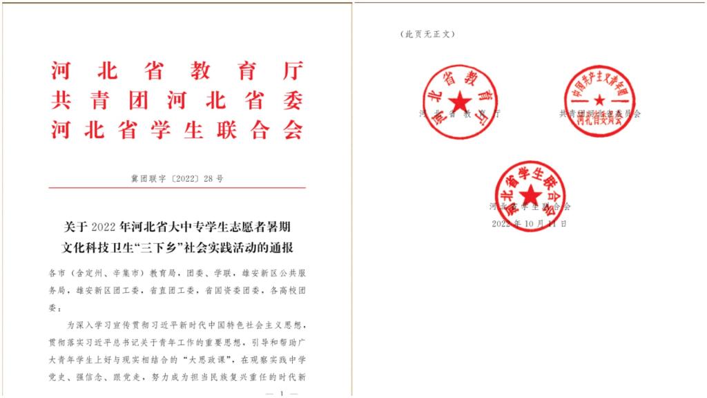 近日,省教育厅、团省委、省学联联合下发《关于2022年河北省大中专学生志愿者暑期文化科技卫生“三下乡”社会实践活动的通报》,经过基层申报、团市委推荐、组织评议等环节,学校脱颖而出,荣获省级“三下乡”社会实践优秀单位。