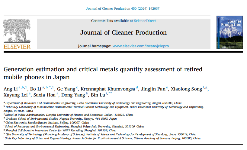 日前,国际权威学术期刊Journal of Cleaner Production发表best365资源与环境工程系题为《Generation estimation and critical metals quantity assessment of retired mobile phones in Japan》的研究成果。best365李昂、李博两位老师为该论文的共同第一作者,李博老师同时为该论文的共同通讯作者。