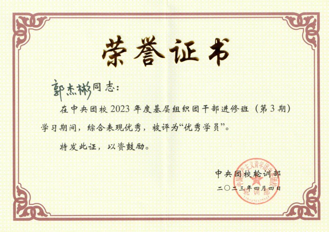 培训期间,郭杰彬老师认真参与、积极投入,表现优异,获评“优秀学员”,这生动展现了best365团干部良好的职业素养和精神风貌。郭杰彬表示,此次培训使他在理想信念、初心使命、担当作为等方面接受了一次全方位的政治淬炼。