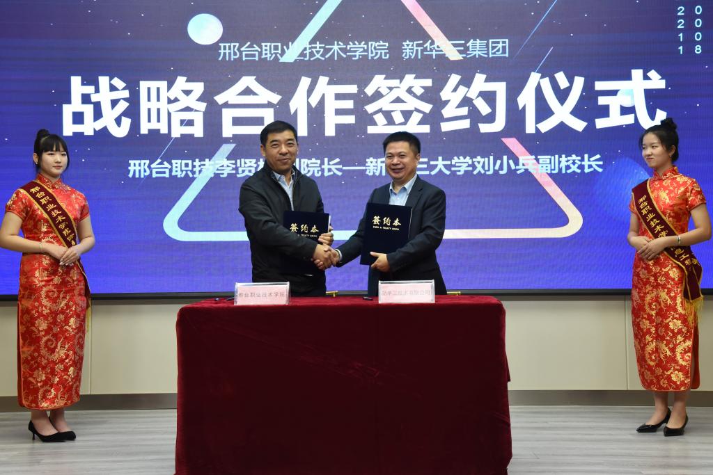 随后,学院副院长李贤彬、新华三大学副校长刘小兵代表双方签署了战略合作协议。根据协议,双方就共建大数据学院、河北省1+X认证考试中心、“双师型”教师研修基地、大数据创新应用研究院及共同开发校企合作课程资源、提供实习实训机会等方面进行全方位战略合作。
