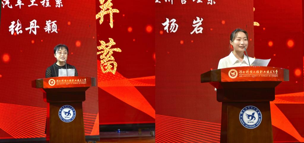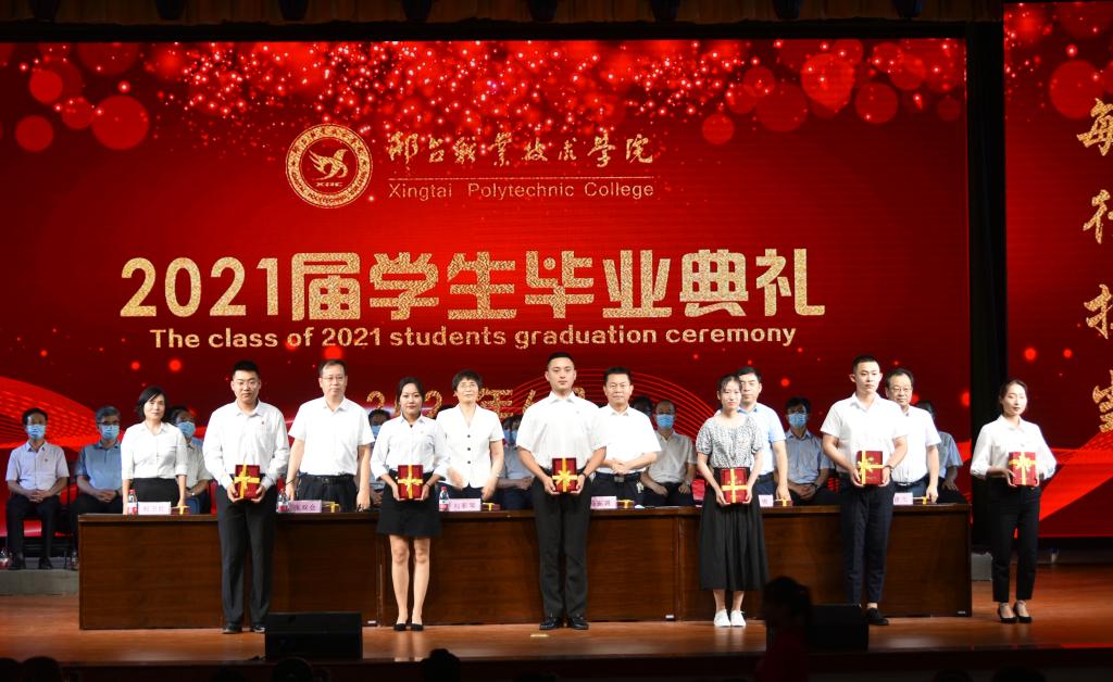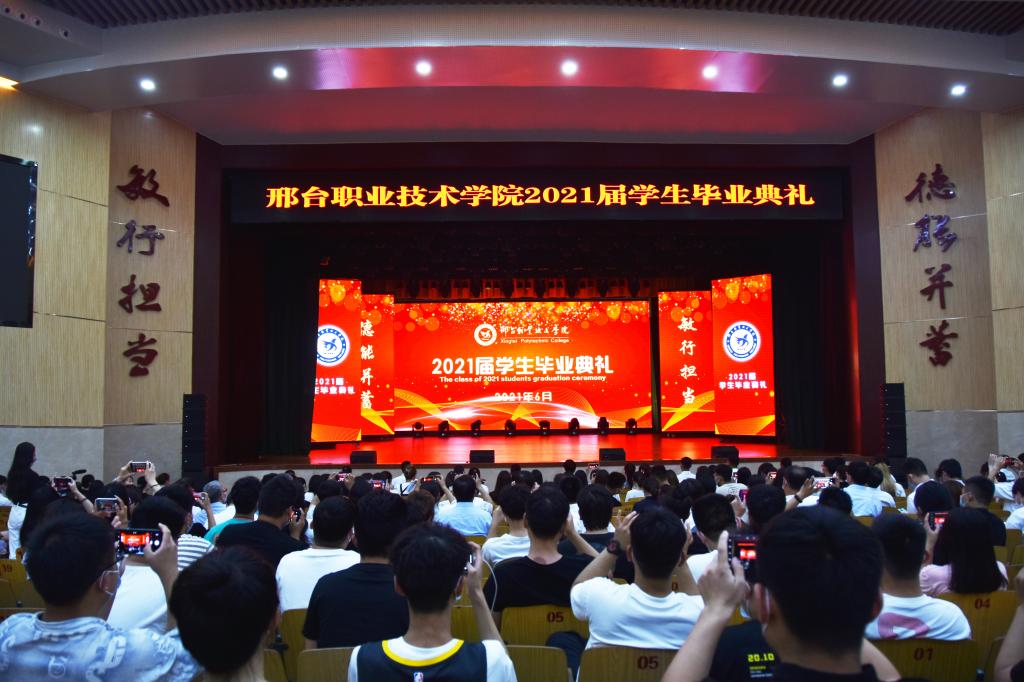 典礼开始前,全体师生欣赏了毕业生代表带来的朗诵《青春报告》、机电工程系毕业生孙浩鑫创作的歌曲《念夏离别》、观看了毕业MV《昨日青空》。毕业典礼在庄严的国歌声中正式拉开序幕,随后,学校党委书记刘彩琴宣读《邢台职业技术学院关于表彰2021届优秀毕业生的决定》,学校领导向毕业生代表颁发了优秀毕业生证书。中国大学生自强之星获得者经济管理系杨岩同学、全国教学能力大赛一等奖获得者汽车系张丹颖老师作为代表分别发言。