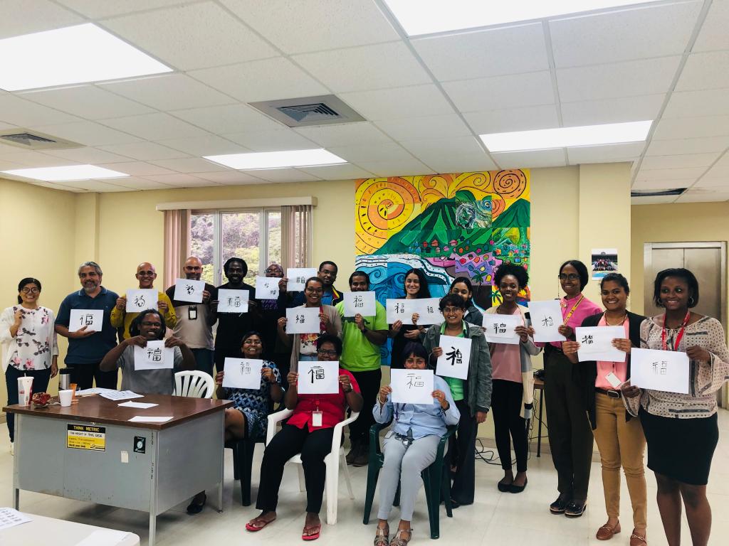 虽然是初次接触中国书法,但是西印度大学圣奥古斯丁校区地震研究所的学员们认真努力地书写着每个笔画,点横竖撇捺的不断练习让他们最终书写出了自己满意的作品。看着自己的作品,每个人脸上都洋溢着幸福。
