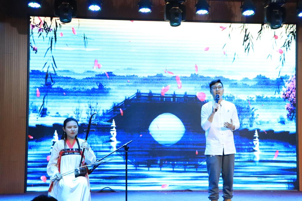 晚会在热情欢快的舞蹈串烧中拉开序幕,首先是以青春为主题的“风华正茂”篇章,相声《三大才子》配合默契,令人捧腹;《歌曲串烧》展现了大学生的青春与激情。第二篇章是以古风文化为主题的“曲意韶华”,独唱《烟花易冷》和二胡的完美结合,令人回味无穷;中基华公司代表带来的戏曲《三家店》,京腔韵味十足,令观众耳目一新。最后是以爱国情怀为主题的“楚囊之情”篇章,退伍军人的《一招制敌》,动作干净利落,展现了军人的飒爽英姿;朗诵《我的祖国》慷慨激昂、饱含深情,表达出对祖国的忠诚和热爱。晚会期间,刘志忠书记为学生干部颁发聘书并致新年贺词,表达了对全体师生2020年的美好祝愿。