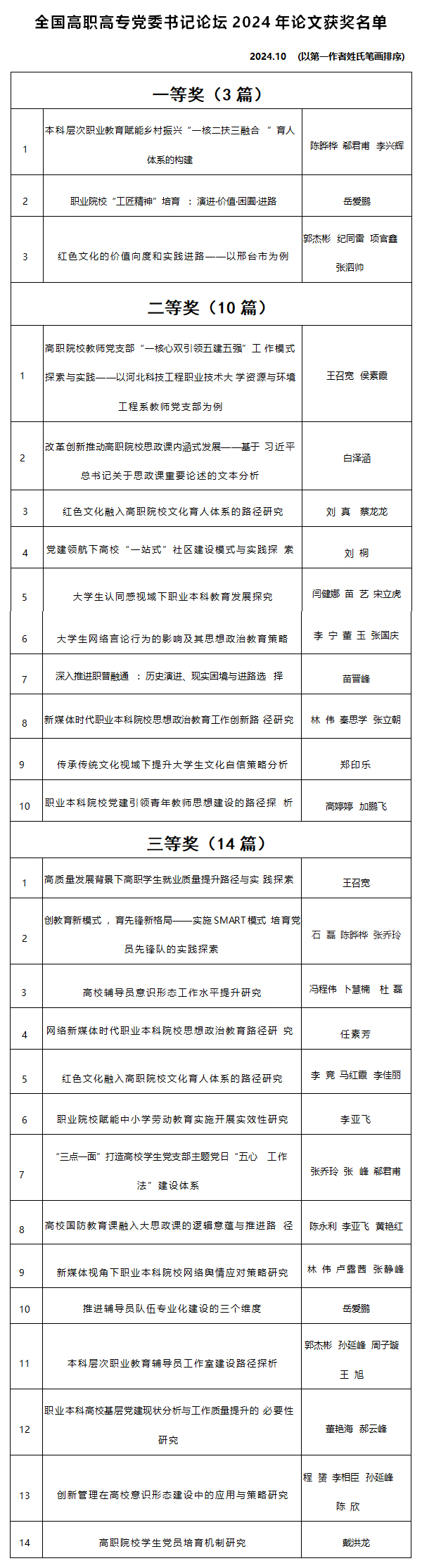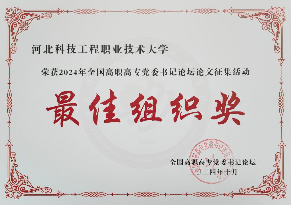 10月25日-27日,全国高职高专党委书记论坛2024年会在天津举办。会上通报了本年度学术论文评审情况,并对22个最佳组织奖院校进行了表彰。今年6月至8月,全国高职高专党委书记论坛举办了2024年论文征集活动,共收到论文768篇,最终评选出一等奖论文81篇,二等奖论文151篇,三等奖论文248篇。best36527篇论文获奖,论文质量和获奖数量均居全国高职院校前列,荣获最佳组织奖,这是best365连续第六年获此殊荣。