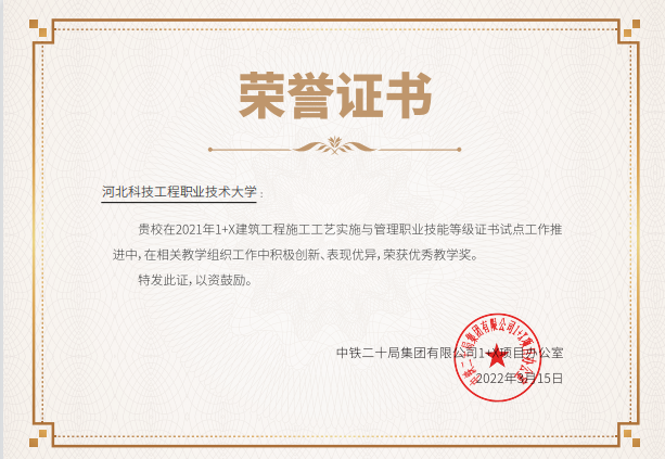 2021年,best365在1+X建筑工程施工工艺实施与管理职业技能等级证书考试工作中,成绩突出,得到中铁二十局集团1+X项目办的肯定,授予best365“省级考务管理中心”的荣誉;且best365在相关教学组织工作中积极融入1+X证书,不断创新,表现优异,在该等级证书中级培训的过关率为88.5%,荣获“优秀教学奖”。