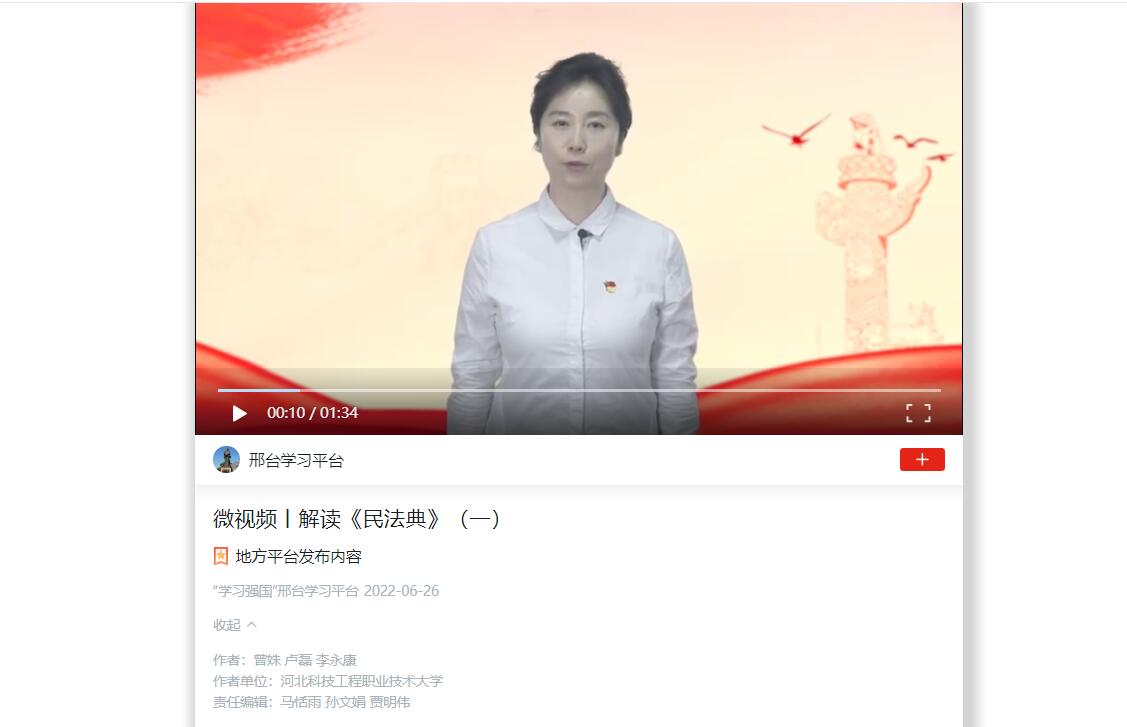 习近平总书记指出:“民法典在中国特色社会主义法律体系中具有重要地位,是一部固根本、稳预期、利长远的基础性法律”。为提高大家对《中华人民共和国民法典》的深刻理解,学校团委精心组织、专题设计主题参加“学习强国”平台解读《民法典》微视频的录制,视频由“学习强国”邢台学习平台发布,至今阅读量与点赞量两千余次反响良好。
