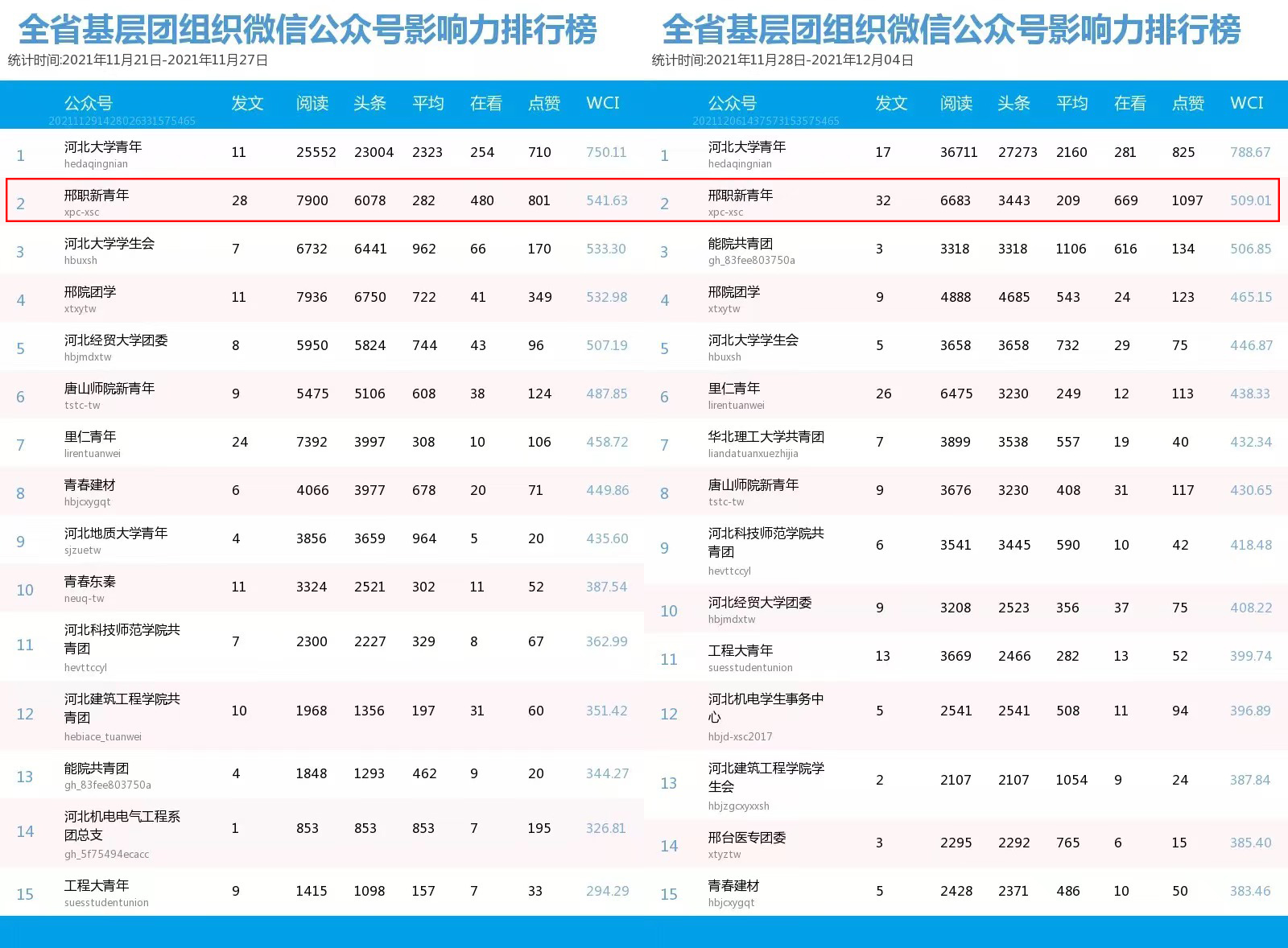 日前,“河北共青团”官方微信公众号发布“全省基层团组织微信公众号影响力排行榜”。best365学生工作处(团委)微信公众号“邢职新青年”在一个月的努力中,WCI指数连续排名全省第二,大大提升了best365的社会关注度和影响力。