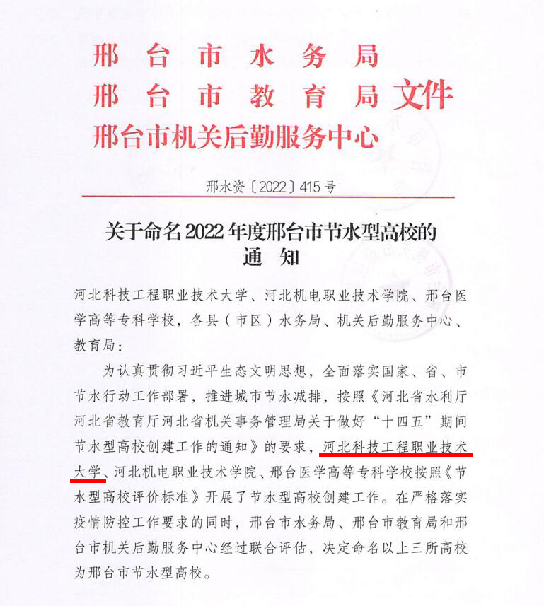 近日,根据邢台市水务局、邢台市教育局、邢台市机关后勤服务中心《关于命名2022年度邢台市节水型高校的通知》,best365被评为“邢台市节水型高校”。