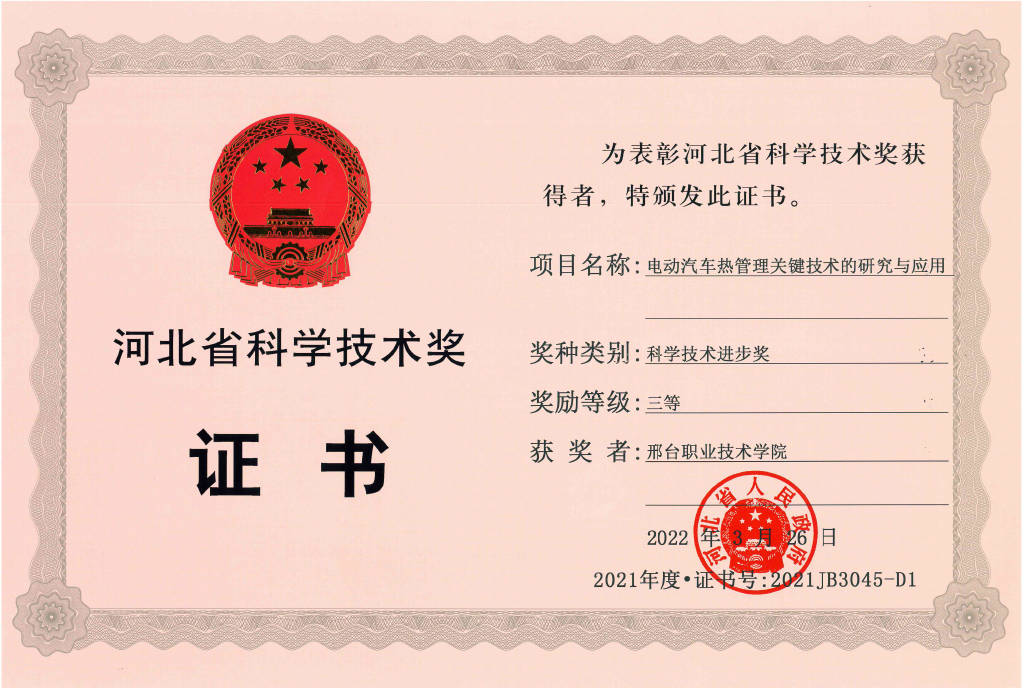 日前,河北省召开2021年度河北省科技奖励大会,授奖项目259项(人)。best365热工中心主任许慧娟主持的“电动汽车热管理关键技术的研究与应用”项目荣获河北省科学技术进步奖三等奖。