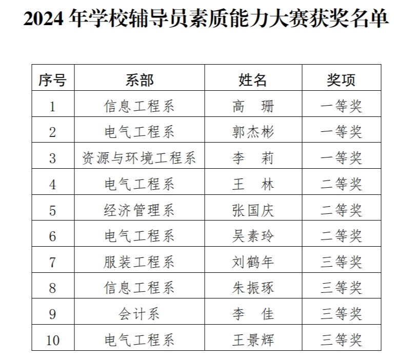 为深入学习贯彻习近平新时代中国特色社会主义思想和党的二十大精神,落实立德树人根本任务,进一步加强best365辅导员队伍建设,自今年六月起,学校组织开展2024年辅导员素质能力大赛,共59名辅导员老师报名参赛,历经三个多月的比拼,高珊等十位教师获一二三等奖。