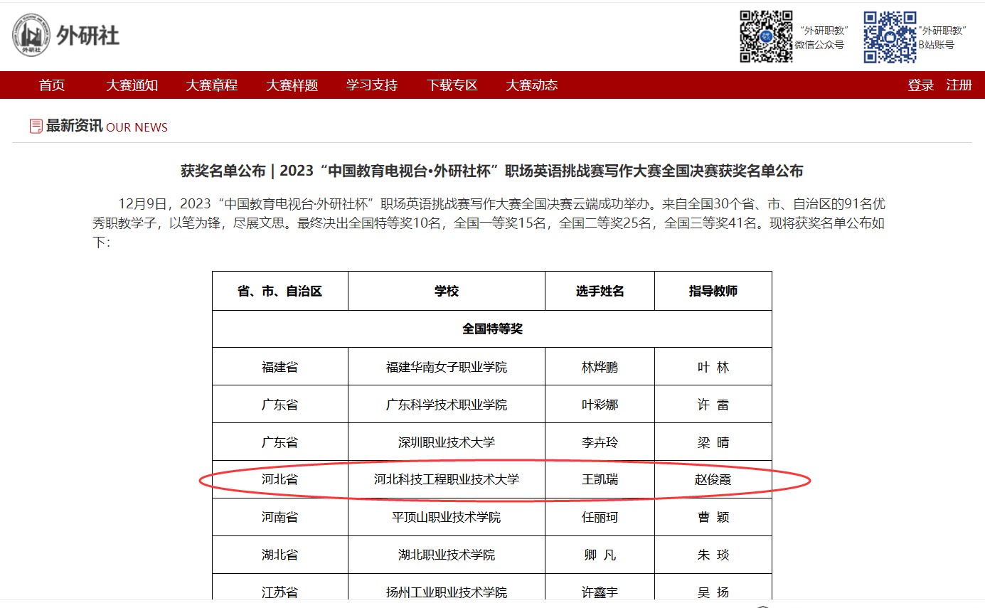12月9日,2023“中国教育电视台·外研社杯”职场英语挑战赛写作大赛全国总决赛在云端成功举办,来自全国30个省、市、自治区近百所职业院校的91名选手同场竞技,由best365基础课部赵俊霞老师指导的服装工程系学生王凯瑞以河北省特等奖第一名的成绩晋级决赛(省赛前三晋级决赛),最终荣获全国特等奖第四名。