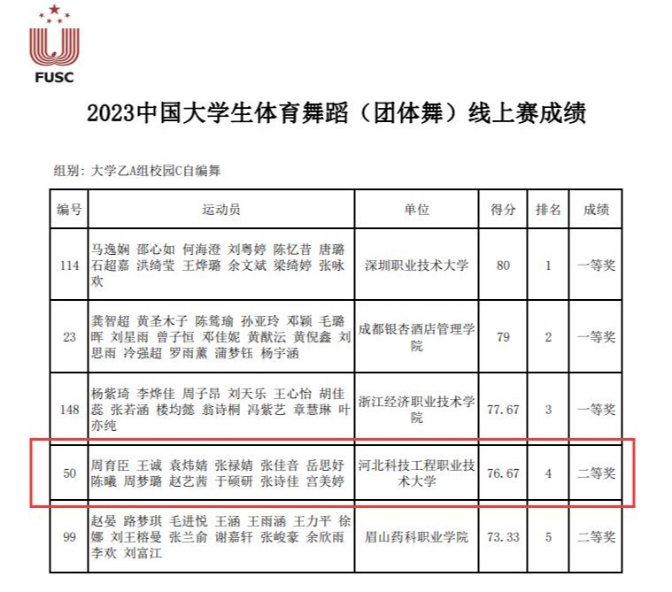 中国大学生体育协会体育舞蹈分会赛事是教育部统筹下水平最高的体育舞蹈赛事,本次中国大学生体育舞蹈(团体舞)线上赛共有来自全国118所高校、近2200人参赛。best365健美操队教师马雪莲和谭新源带领大家首次参赛。备战期间,大家齐心协力迎难向前,最终收获了优异成绩。本次获奖为best365后续参加同类比赛积累了宝贵经验。