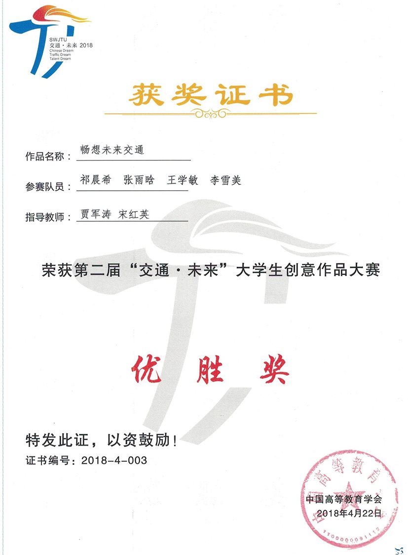由中国高等教育学会主办,团中央学校部支持,西南交通大学、上海交通大学、西安交通大学、北京交通大学、郫都区人民政府、成都创新创业示范基地管委会共同承办的第二届“交通·未来”全国大学生创意作品大赛于4月23日圆满落下帷幕,我院代表队(祁晨希、张雨晗、王学敏、李雪美)的作品《畅想交通未来》荣获佳绩。