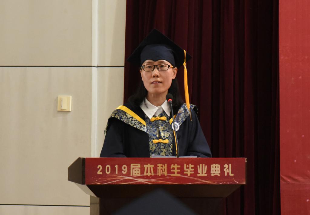毕业典礼在雄壮的国歌声中拉开帷幕。学院党委书记刘彩琴发表致辞,她代表学院向圆满完成学业的201名本科毕业生表示祝贺,向一直悉心教导和相伴本科生成长的全体老师致以诚挚的感谢。她指出,学院十分重视本科生的教育与培养,并时刻关注着同学们的成长,努力为同学们营造良好的环境。刘书记高度肯定了四年来同学们取得的可人成绩,累计100余人次获得国家各级各类奖学金资助;40余人次获得“优秀班干部”、“三好学生”等荣誉称号;30余名同学在国家和省级各类竞赛中获得佳绩,16人考上研究生深造。并对毕业生们提出三点希望,一是勇于承担自身责任,以实际行动反哺回报家人和社会;二是敢于拼搏奋斗,让行动与理想并肩而行;三是把生活掌握在手上,悉心对待日常。最后,刘书记代表学院提前向毕业生发出邀请,今年是学院建校40周年,她希望同学们常回母校看看,离校不断线,关注母校发展,为学院的发展增光添彩,创造出无愧于自我、无愧于时代的人生价值。