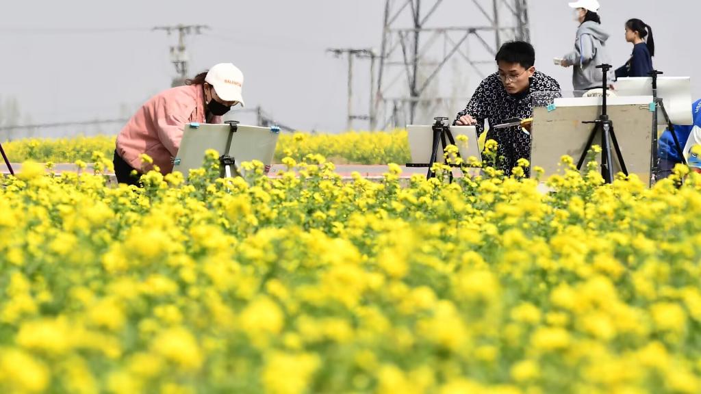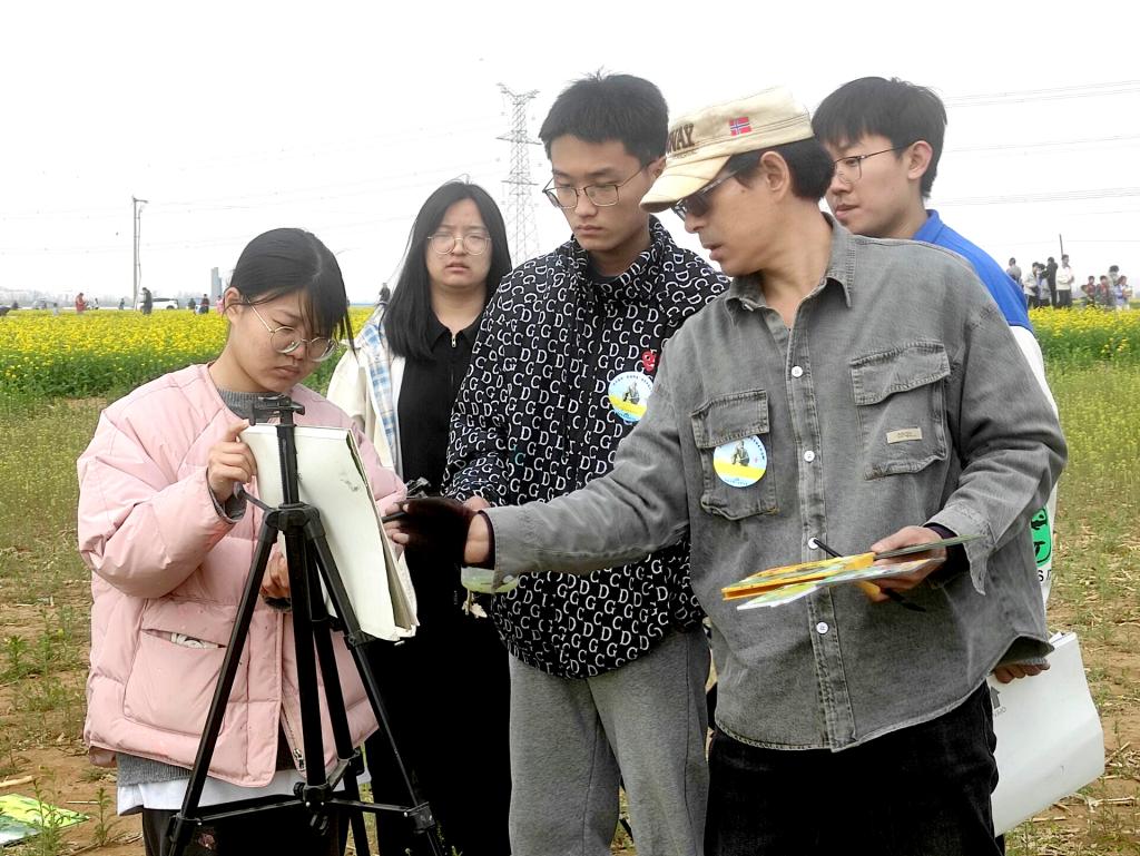 3月26号,戴杰老师再次带领学生参与到邢台市文化广电和旅游局、郭守敬纪念馆、郭守敬美术馆联合举办的“2023太行山文化年,金沙河红薯岭油菜花赏花季”活动中。在活动现场,戴老师给学生做示范讲解,现场进行油菜花绘画教学,并对学生作品进行修改。