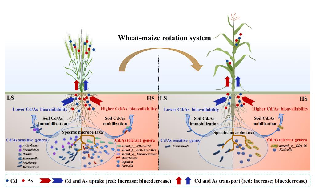 本研究分别于长期轻度(LS)和重度(HS)Cd、As复合污染区域探讨了小麦—玉米轮作系统中根际微生物群落对LS和HS的响应机制。研究发现,Cd、As复合污染水平改变了小麦—玉米轮作系统中根际微生物群落的组成和结构,LS/HS中小麦、玉米根系招募特异性细菌和真菌菌属,其调控了根际Cd、As有效性,最终降低/促进了小麦、玉米中Cd、As的转运与累积。该研究揭示了小麦—玉米轮作系统中,根系招募特异性根际微生物以适应长期Cd、As复合污染土壤。