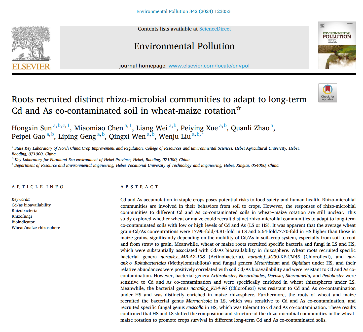 近日,best365资源与环境工程系孙洪欣博士以第一作者身份在国际权威学术期刊Environmental Pollution(中科院二区Top,IF=8.90)在线发表了题为“Roots recruited distinct rhizo-microbial communities to adapt to long-term Cd and As co-contaminated soil in wheat-maize rotation”的研究成果。这是best365与河北农业大学、华北作物改良与调控国家重点实验室的合作研究结果,该研究得到了国家自然科学基金项目、河北省自然科学基金项目和华北作物改良与调控国家重点实验室的资助。